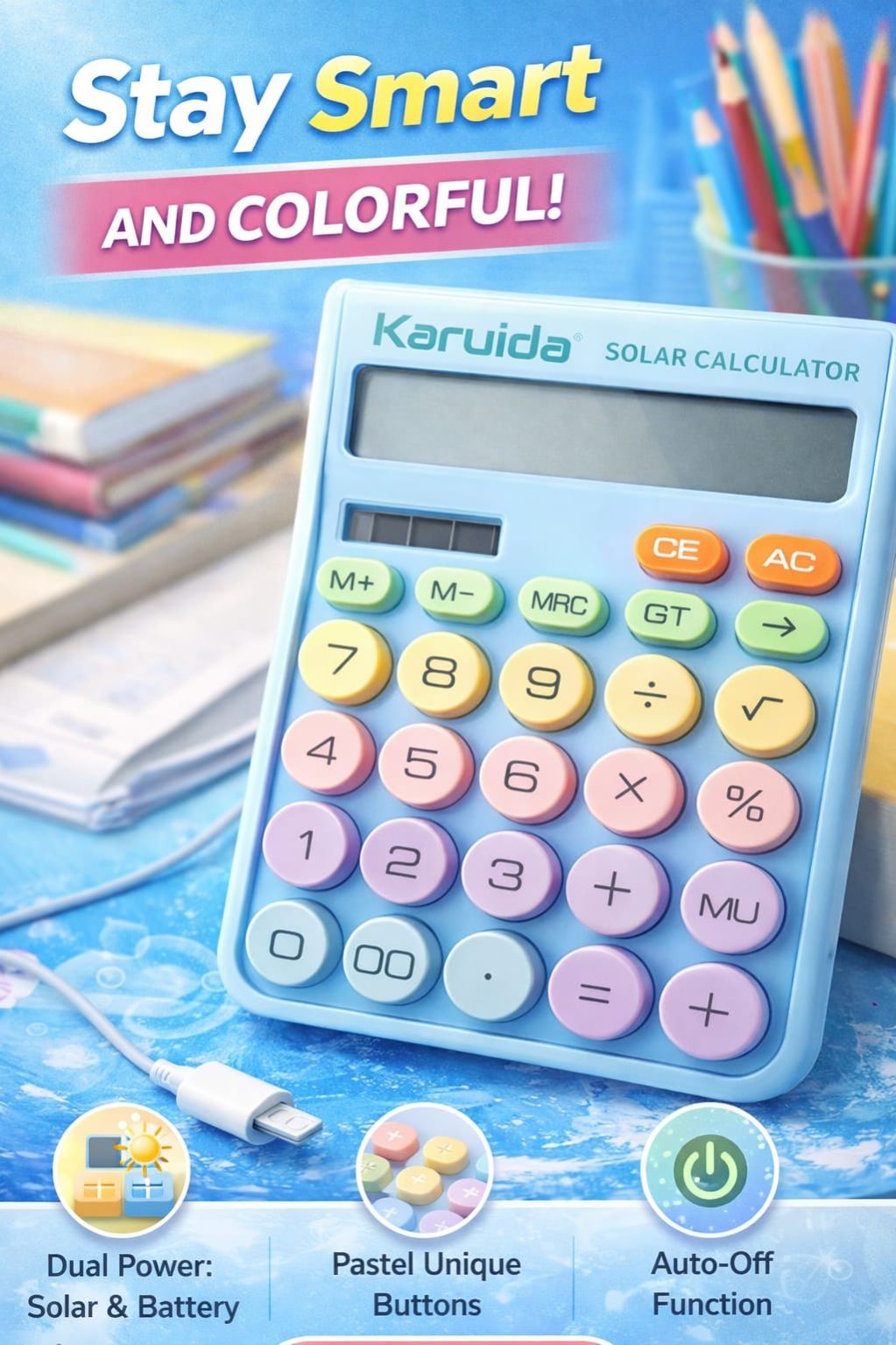 Add a pop of color to your desk with the Karuida Pastel Solar Calculator. Featuring a unique candy-button design, this dual-powered (Solar & Battery) desktop calculator offers essential functions like GT and MU. With its clear display and energy-saving Auto-Off feature, it’s the perfect blend of style and efficiency for school or office use. Bring color to your calculations – order yours today!