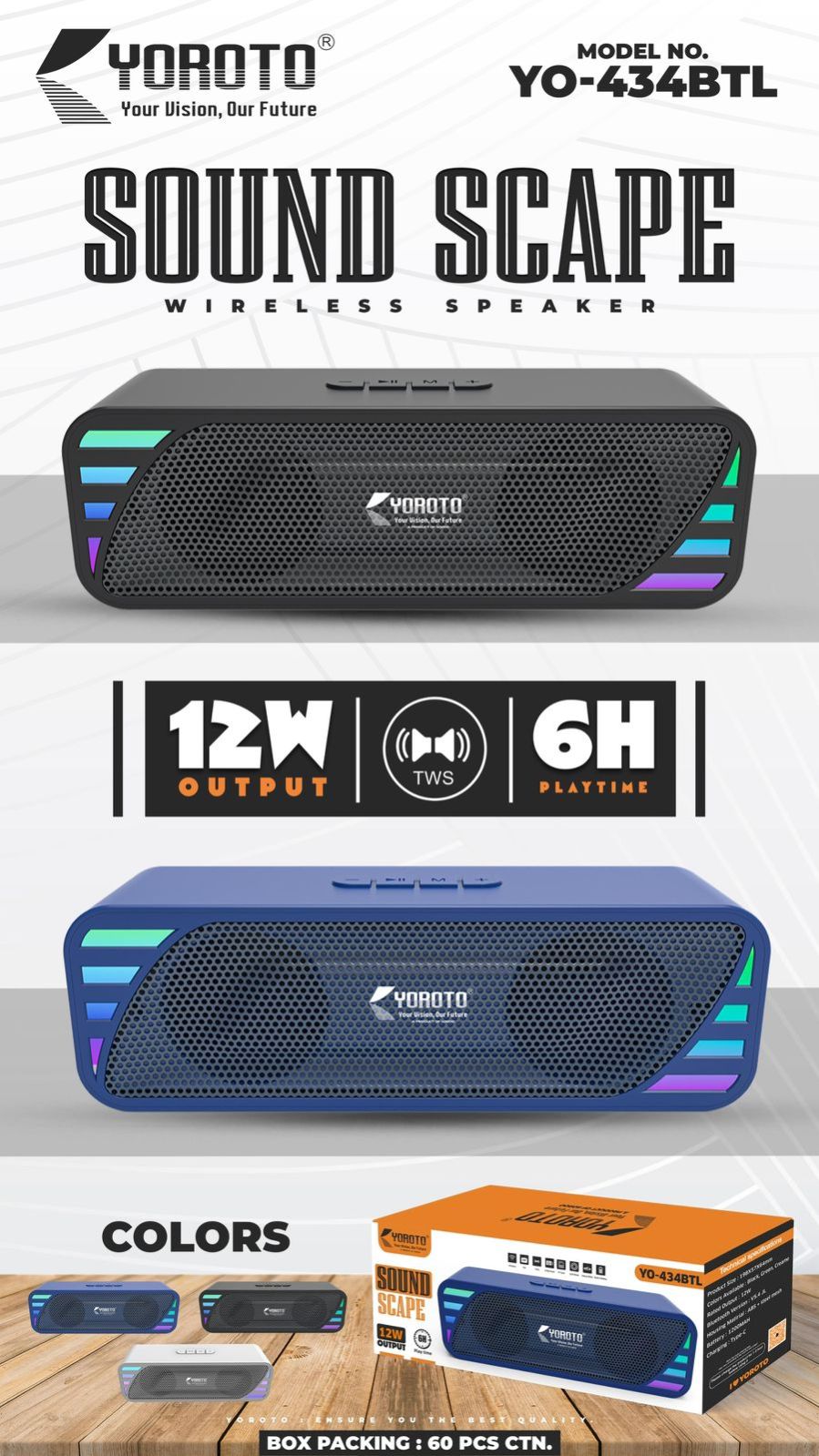 Bring your music to life with the YOROTO Sound Scape YO-434BTL. This 12W wireless speaker features TWS technology, dynamic RGB lighting, and a 6-hour battery life. Compact yet powerful, it’s the perfect companion for high-quality audio on the go. Available in multiple colors with fast Type-C charging.