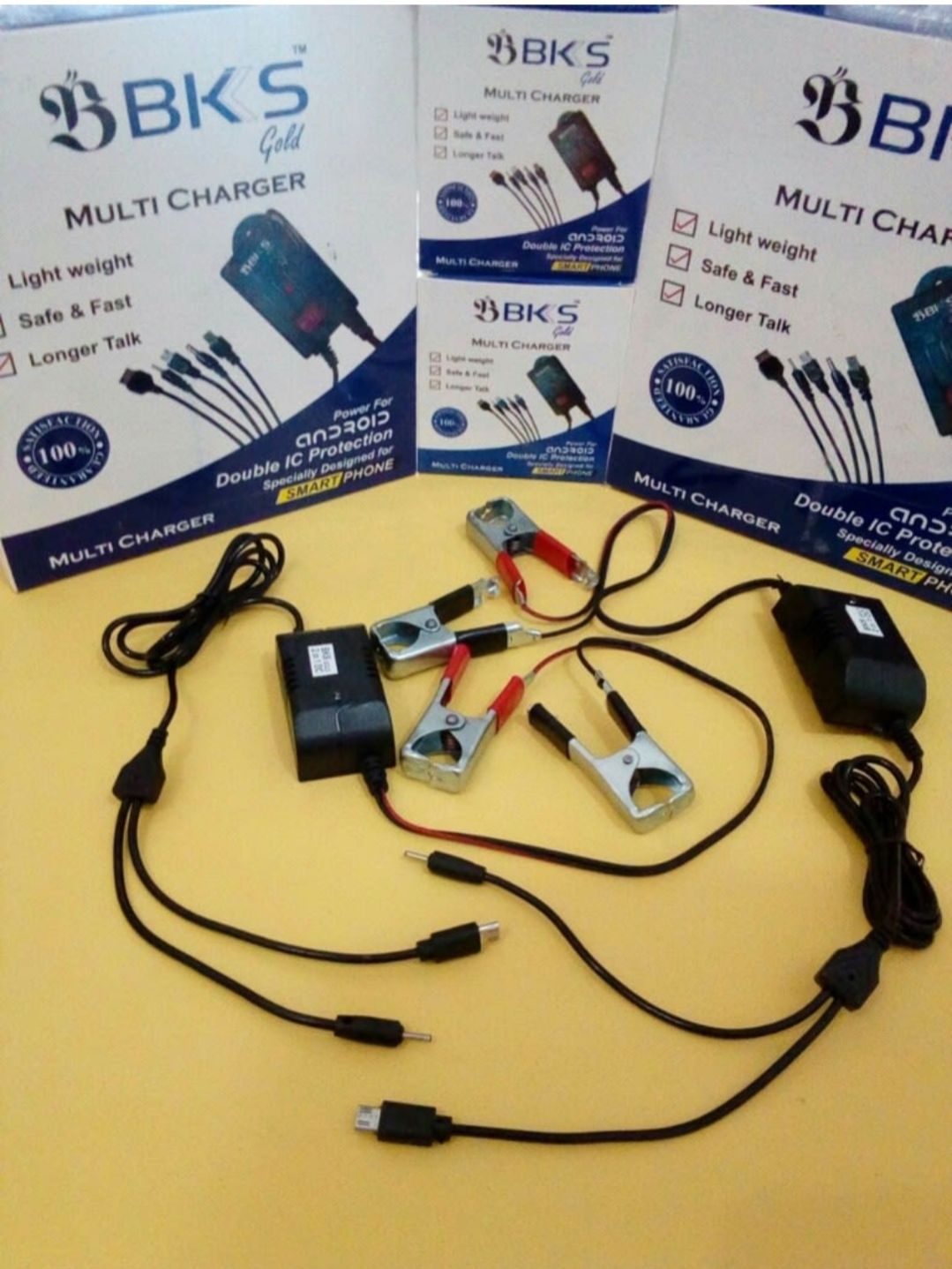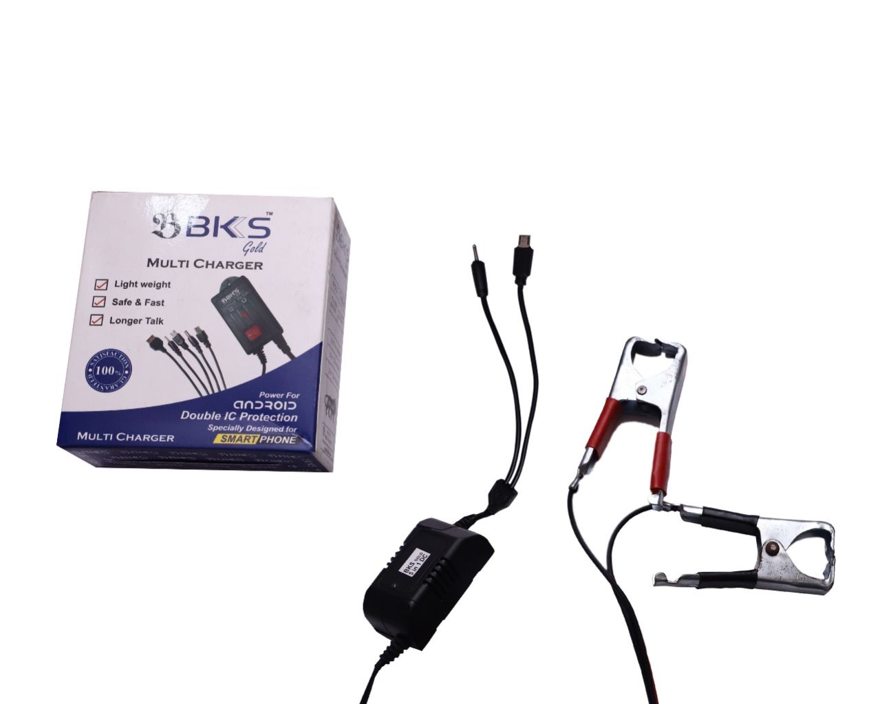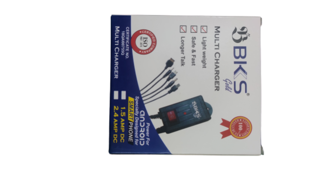 The BKS 2-in-1 DC Charger is a versatile charging solution designed to cater to devices with two distinct connector types. It features: